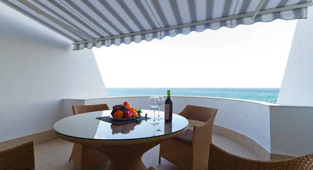 ванная комната с ванной или душем, косметические принадлежности, халаты и тапочки, фен, wi-fi, кабельное ТВ, кондиционер, телефон, мини-бар, балкон с видом на море (на балконе 2 ротанговых кресла, столик, 2 шезлонга)