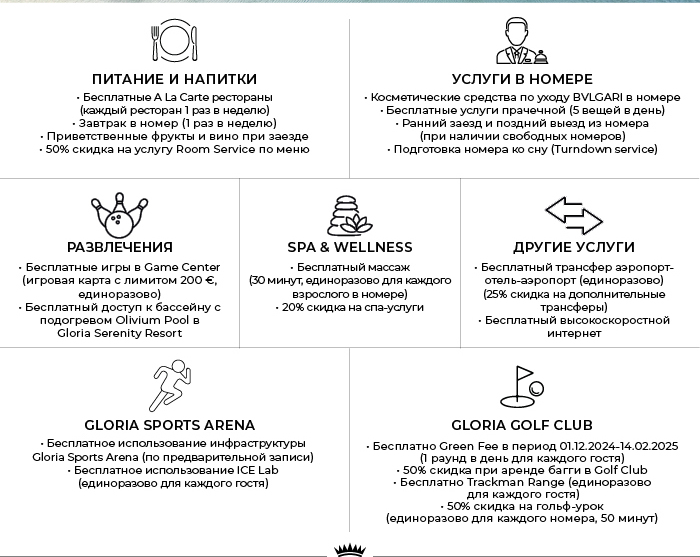 11.11.2024. В новом сезоне 2025-2026 в отеле произойдет ряд изменений. 5 ресторанов A’la Carte (Turkuaz Grill House — гриль, Elia Greek — греческая кухня, Lancora — итальянская кухня, Pescado — испанская кухня, Harem — международная кухня) — ($, 01.05.2025 — 31.10.2025); 2 ресторана A’la Carte (Turkuaz Grill House — гриль, Elia Greek — греческая кухня) — (закрыты 01.11.2025 — 30.04.2026), 3 ресторана A’la Carte Lancora — итальянская кухня, Pescado — испанская кухня, Harem — международная кухня) — ($, 01.11.2025 — 30.04.2026). Рестораны с обслуживанием по меню — для гостей Gloria Golf Resort King Suite, Gloria Golf Resort Owner Villa, Gloria Serenity Resort King Suite, Gloria Serenity Resort Deluxe Villa, Gloria Serenity Resort Serenity Villa, Gloria Serenity Resort Queen Villa, Gloria Serenity Resort King Villa, Gloria Serenity Resort VIP Villa, Gloria Serenity Resort Presidential Villa, Gloria Verde Resort King Suite, Gloria Verde Resort Presidential Villa, держателей карт Platinum и гостей концепции длительного проживания (28 ночей) — (бесплатно). Бронирование ресторанов с обслуживанием по меню — осуществляется при наличии возможности и осуществляется службой по работе с гостями минимум за 2 дня. Обслуживание номеров — Gloria Golf Resort King Suite, Gloria Golf Resort Owner Villas, держателей карт Platinum и гостей концепции длительного проживания (28 ночей) — (бесплатно в течение всего дня). В отеле появилась новая категория номеров Family Suite Pool Access (семейный люкс с выходом к бассейну: 2 спальни, гостиная, 2 ванные комнаты с душем, 2 санузла, бассейн общего пользования, терраса). Во всех категориях номеров гостям предлагаются средства для ванны и тела от Rebul Atelier, для номеров King Suite и Owner Villa — Bvlgari. Официальное письмо от отеля.