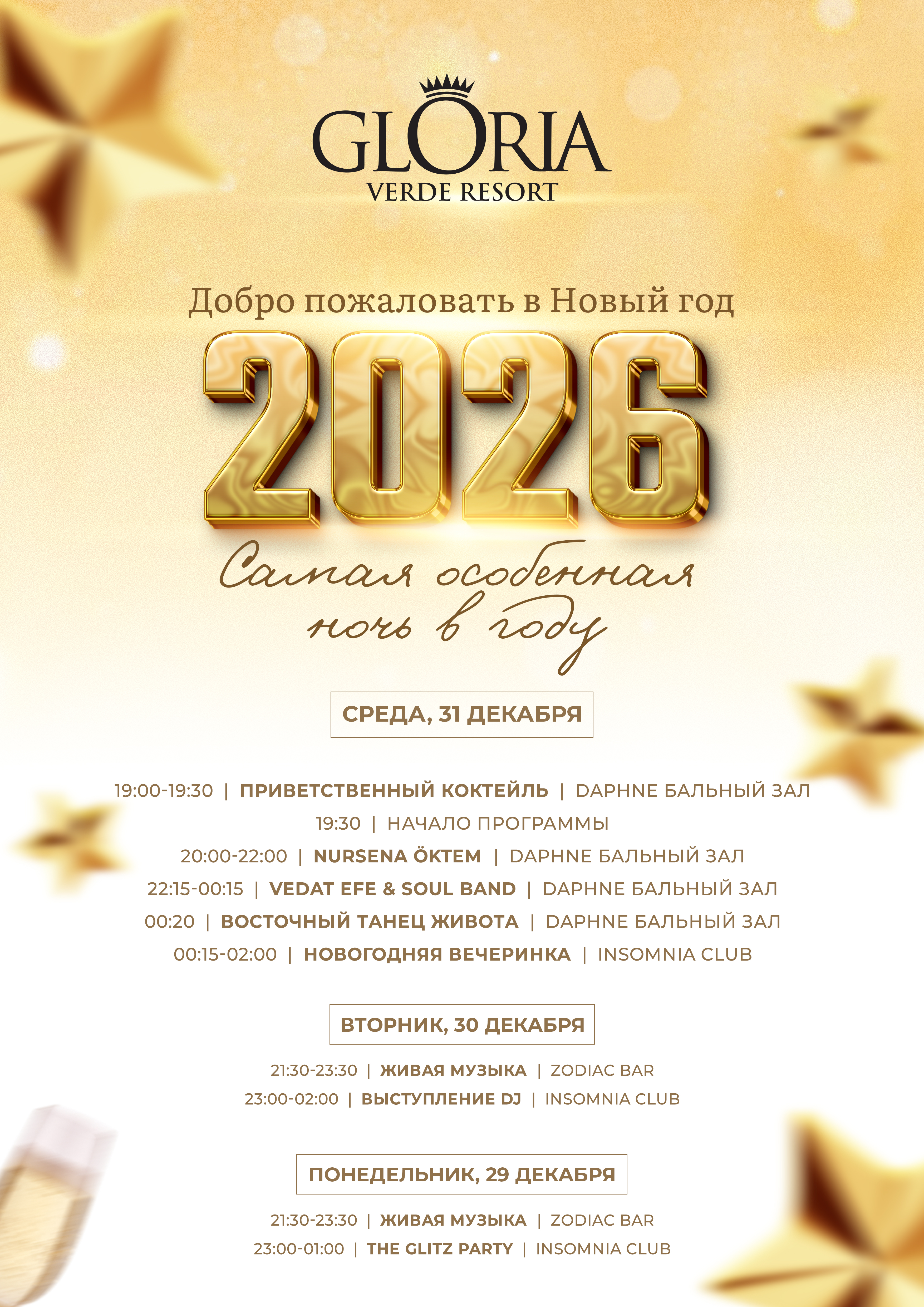 11.11.2024. В новом сезоне 2025-2026 в отеле произойдет ряд изменений. 2 ресторана A’la Carte (Bazilika — французская кухня и La Famosa — итальянская кухня) — ($, 01.04.2025 — 30.04.2026). Рестораны с обслуживанием по меню — для гостей Gloria Verde Resort Presidential Villa, Gloria Verde Resort King Suite, Gloria Golf Resort King Suite, Gloria Golf Resort Owner Villa, Gloria Serenity Resort King Suite, Gloria Serenity Resort Deluxe Villa, Gloria Serenity Resort Serenity Villa, Gloria Serenity Resort Queen Villa, Gloria Serenity Resort King Villa, Gloria Serenity Resort VIP Villa, Gloria Serenity Resort Presidential Villa, держателей карт Platinum и гостей концепции длительного проживания (28 ночей) — (бесплатно). Бронирование ресторанов с обслуживанием по меню — осуществляется при наличии возможности и осуществляется службой по работе с гостями минимум за 2 дня. Ресторан Select — для гостей Gloria Verde Resort Select Villa, Gloria Verde Resort Presidential Villa, Gloria Verde Resort King Suite (бесплатно); для остальных категорий номеров ($). Обслуживание номеров в летний сезон (01.04.2025 — 31.10.2025) — для гостей Select Villa, Presidential Villa, King Suite, держателей карт Platinum и гостей концепции длительного проживания (28 ночей) — (бесплатно в течение всего дня); для остальных категорий номеров — (бесплатно с 23:00 до 07:00). Обслуживание номеров в зимний сезон (01.11.2025 — 31.03.2026) — Select Villa, Presidential Villa, King Suite, держателей карт Platinum и концепции длительного проживания (28 ночей) — (бесплатно в течение всего дня); для остальных категорий номеров — ($). Официальное письмо от отеля.