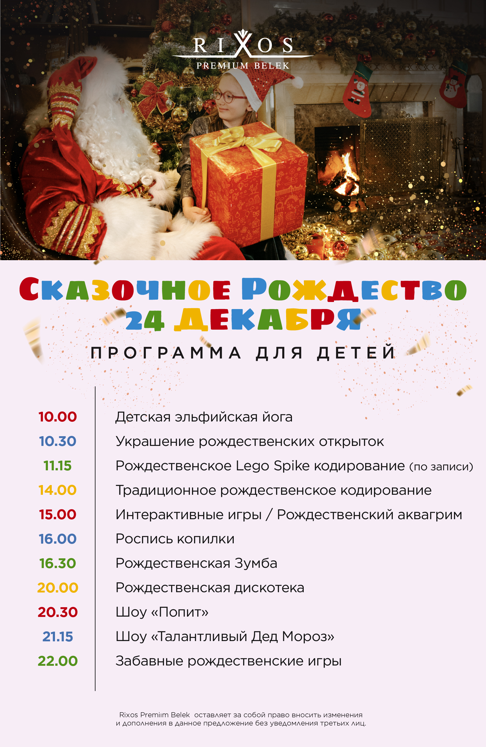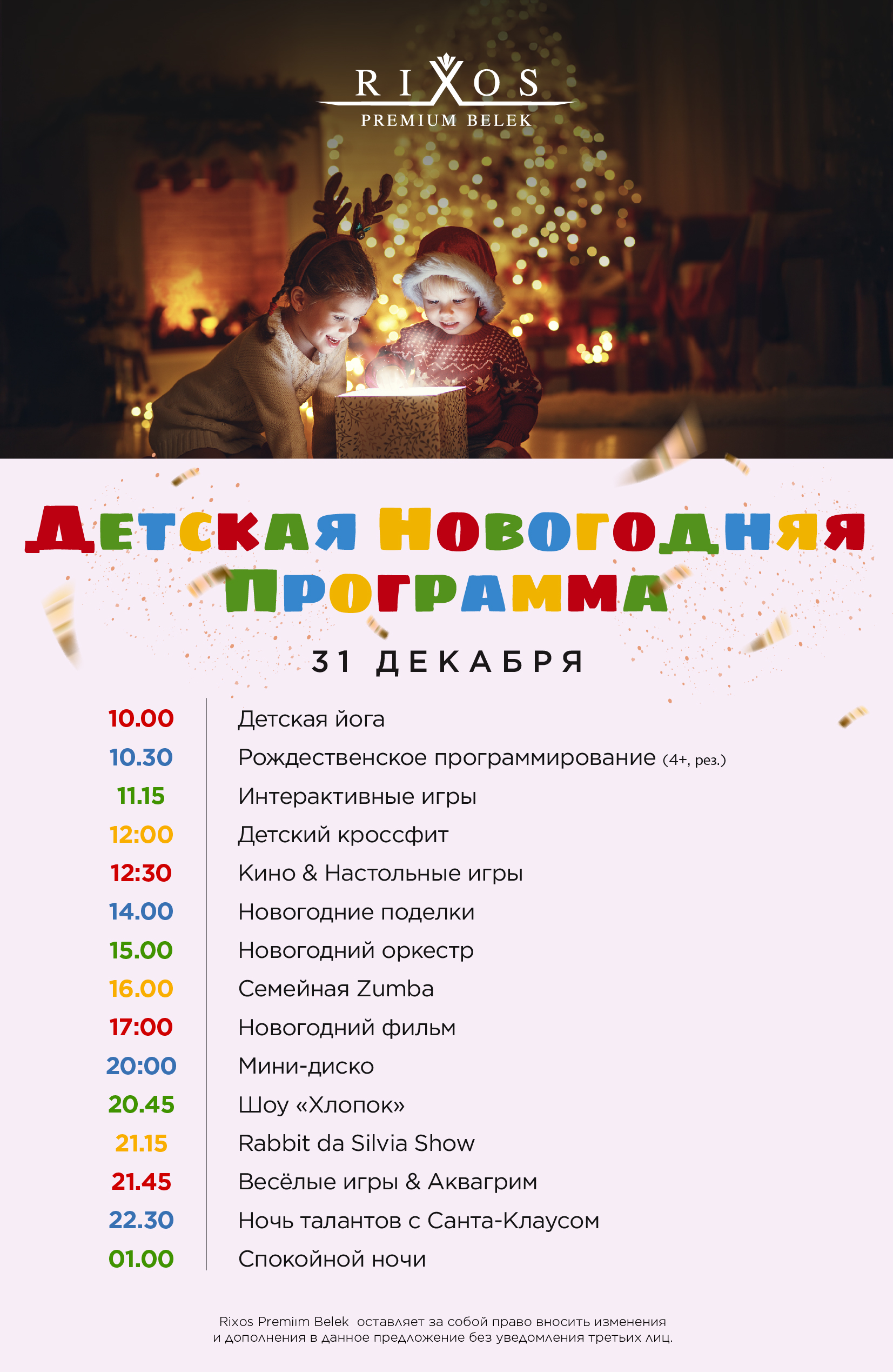 Детский клуб Rixy (0-16 лет), детские шоу, детские фестивали, олимпийские игры, игры в бассейне, ферма, утренняя гимнастика, мастер-класс по приготовлению коктейлей, рисование техникой эбру, лека из глины, кемпинг, ароматические камни, музыкальные игры, квесты, техно комната, робототехника, кулинарный мастер-класс, академия молодых шеф-поваров, караоке, арт-студия, рыбалка, стрельба из лука, оригами, шоу талантов, настольные игры, мастер-класс по приготовлению печенья, надувание воздушных шаров, матч роботов, мини-боулинг, настольный теннис, детская дискотека, аквагрим, рисование на текстиле, роспись по дереву, занятиЯ с конструктором Лего, надувания е мыльных пузырей, мега Дженга, интерактивные игры, мультики, рисование, PlayStation, бильярд, ежедневные турниры, игрушечная мастерская, день природы, зумба, йога, Fit Mat, кроссфит, футбольная академия, прыжки на батуте в воде, TRX, табата, Bungee Fly, боксинг, Kangoo Jumps, аэройога, прыжки на батуте, теннис, курсы плавания.