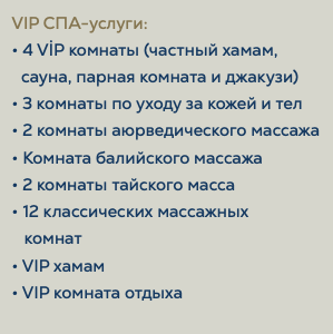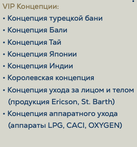 Спа-центр ($), различные виды массажа ($), VIP спа-услуги ($), VIP концепции ($), парикмахер ($).