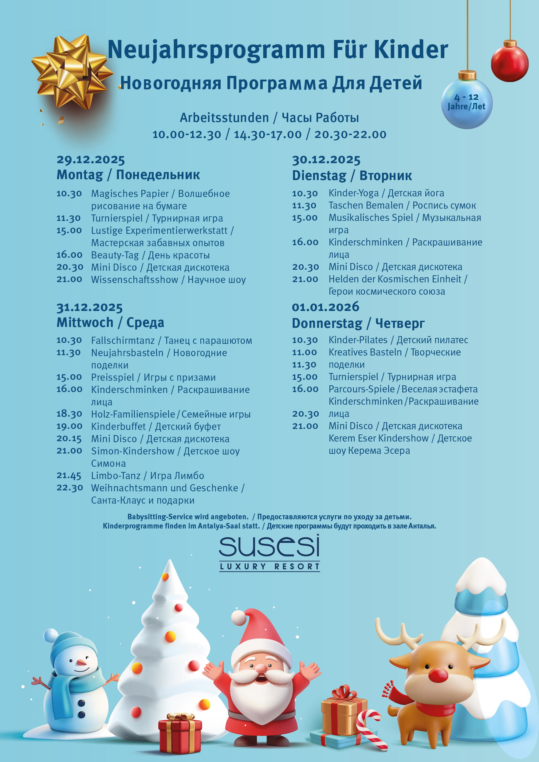 Мини-клуб (4-7 лет), мини-дискотека, аквагрим, детский кинотеатр, спорт, мини-турниры и др.