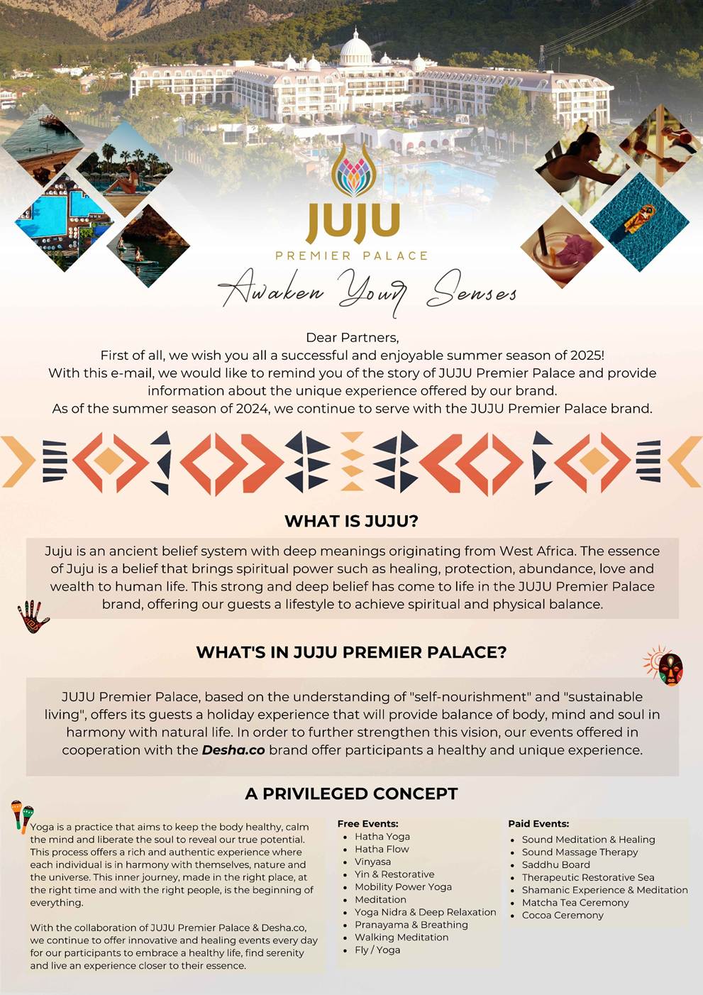 26.03.2025. Отель продолжает работату над брендом Juju Premier Palace, начиная с летнего сезона 2024 г. Juju — это древняя система верований с глубоким смыслом, происходящая из Западной Африки. Суть Juju — это вера, которая приносит духовную силу (исцеление, защита, изобилие, любовь и богатство в жизнь человека). Отель предлагает гостям отдых, способствующий достижению духовного и физического равновесия. В отеле проходят мероприятия в сотрудничестве с брендом Desha.co, которые направлены на баланс тела, ума и души в гармонии с естественной жизнью: хатха-йога, хатха-флоу, виньяса, медитация, йога-нидра и глубокая релаксация, флай-йога (бесплатно); звуковая медитация, звуковой массаж, терапевтическое восстановление и медитация, церемония чая матча, церемония какао, пранаяма и дыхательная медитация при ходьбе ($). Официальное письмо от отеля.